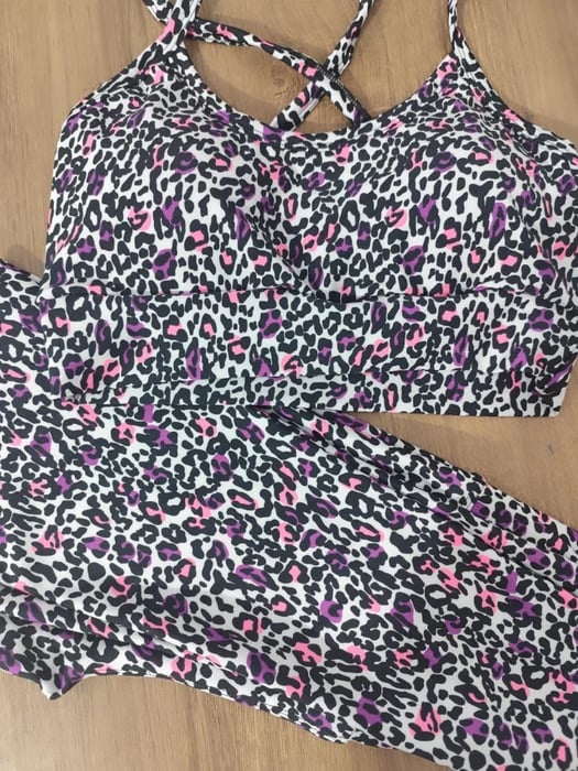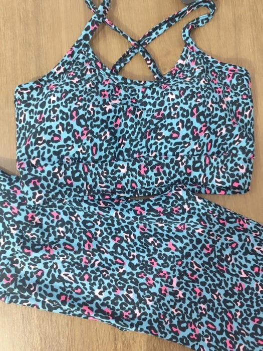 Conjunto composto por calça cintura alta e top com bojo removível, fabricado no tecido suplex poliéster.